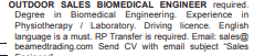 OUTDOOR SALES BIOMEDICAL ENGINEER required. Degree in Biomedical Engineering. Experience in Physiotherapy / Laboratory. Driving licence. English language is a must. RP Transfer is required. Email: sales@ beamedtrading.com Send CV with email subject “Sales Engineer”